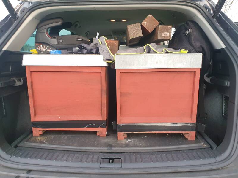 Fünf Völker, vier Kanthölzer und diverses Bienenmaterial – das Auto war randvoll. Mehr ging nicht.